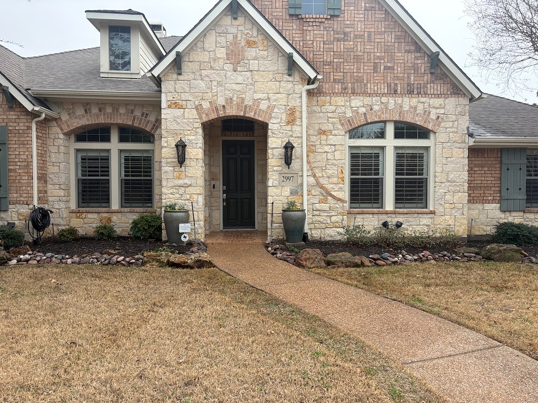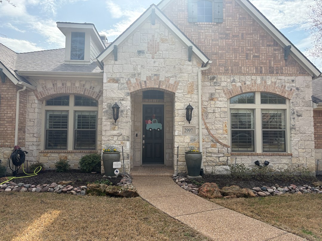 This project in Frisco, TX involved a straightforward house wash requested by the homeowner to address organic growth on the stone at the front of the house. The homeowner noticed mold and mildew buildup that was affecting the look of the facade and wanted the exterior refreshed.